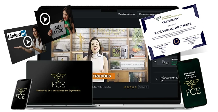 Os principais da FCE diferenciais são: é a única Formação em Consultores de Ergonomia do Brasil reconhecida pelo MEC. Além disso, sua professora atua ativamente nas empresas com ergonomia há 8 anos, portanto te passará a prática do dia a dia e não apenas teoria como na maioria das capacitações. Ainda, por 12 meses você terá o acompanhou tirando dúvidas com a Debora Dengo, para te guiar no seu começo, aprenderá e receberá o modelo dos laudos das Debora em word editável para iniciar nas empresas já realizando uma análise ergonômica de alto nível. A didática de Debora Dengo é incomparável no mercado, pois em toda aula mostra exemplos práticos de análises reais feitas em empresas em vídeo, mostrando o passo a passo, é como se você estivesse dentro da empresa atuando junto com a Debora, pois enxergará dentro do curso o que os olhos dela enxergam através das centenas de vídeos e fotos de análises reais. como E pra fechar, aprenderá as técnicas mais atuais de prospecção, captação e fechamento com as empresas para entrar no mercado de trabalho rapidamente, sabendo quanto e como cobrar pelos serviços de ergonomia prestados. A Debora não esconde nada ou retém informação. 100% das estratégias de atração, captação e fechamento de clientes que ela aplica em sua empresa, na Soluções Ergonômicas, ela compartilha em detalhes com os alunos.